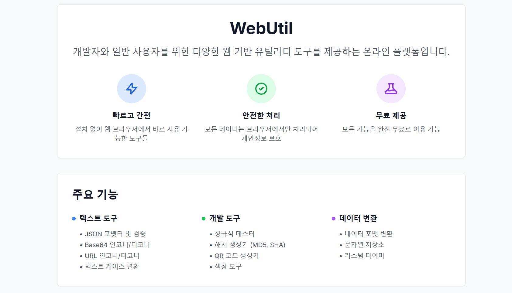 개발자 필수 웹 유틸리티 모음. Base64 인코딩, URL 인코딩, JSON 포맷터 등 자주 쓰는 도구를 한 곳에서 무료로 사용할 수 있습니다.
